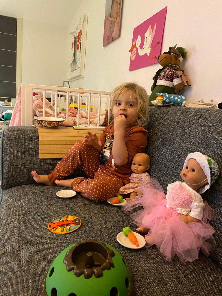Dinsdag 14 dec, wat een dag. Buiten is het super ongezellig druilerig schijtweer dus zit ik weer een hele dag binnen. Van het nieuws word ik ook niet bepaald vrolijk, dat gaat van de rechtszaak tegen Thierry Baudet naar de beschuldigingen aan het adres van Borsato naar de leeg geveegde agenda 2022 van André Hazes, om maar even wat te noemen. Echt mega interessant allemaal… In de opmars naar nieuwe strengere maatregelen naast de avond lockdown die nu al van kracht is, wordt gedurende de dag duidelijk dat de basisscholen volgende week al hun kerstvakantie moeten inluiden. Ik app alvast wat mensen dat ik beschikbaar ben voor eventuele opvang van kinderen, laat het meteen ook even aan de overburen weten, zij hebben twee kids op de basisschool. Eigenlijk is het een verkapte ‘Hallo mensen, ik verveel mij!!’-noodkreet. Wat is het dan fijn als vriendlief thuiskomt zodat ik eindelijk weer iemand heb om tegenaan te kletsen. Die vervolgens gek wordt van mijn geklets, en liever een uur naast Lilly-Sofie zit als hij haar naar bed brengt. Die avond werd me duidelijk hoezeer een tweede kind je relatie onder druk kan zetten… Of zou het puur aan mijn verlof liggen dat ik er zo een ongezellig mens van word? In elk geval kijkt hij ook uit naar het moment dat ik weer aan het werk ga… Het toeval wilde dat ik de volgende dag had afgesproken even op mijn werk langs te komen met Rosie-Lynn. Maar eerst stond de kijk-dansles van Lilly-Sofie op de planning, in het kinderkookcafé in het Vondelpark. Normaliter is dat papa’s programma op de woensdag, mama was dan ook nog nooit mee geweest naar de dansles. Nu ik verlof heb kon ik eindelijk een keer zelf mee, en dit keer was het een speciale kijkles voor ouders, en tevens de afsluiting van het lesblok. Daarna dus door naar mijn werk met Rosie-Lynn, dan hadden we om 13u nog een rondleiding op een basisschool, en stond er daarna nog een bezoek aan mijn schoonouders op de planning… Waar ik me op dinsdag dus nog opgesloten voelde tussen 4 muren, had ik op woensdag ineens een hels programma voor de boeg! We besloten de -inmiddels opgeknapte- bakfiets in te zetten en ik nam Rosie-Lynn mee in de draagzak. Halverwege (nou eerder op een derde van de route) onze tocht naar het kinderkookcafé wisselde ik al de bakfiets in voor de gewone fiets, want fietsen met een baby in de draagzak en een flinke peuter in de bakfiets zonder elektrische ondersteuning als je net bevallen bent, bleek toch een iets te heftige opgave. De kijkles was een feestje om te zien, Lilly-Sofie liet onder leiding van de dansjuf vol trots haar mama zien wat ze deze periode allemaal geleerd had. Ik had ondertussen Rosie-Lynn op schoot , tot het net iets te warm werd op mijn schoot…. De geur was onmiskenbaar; hoogste tijd dat je naar papa gaat die in het café aan de koffie zat 😈 ! Daarna door naar de school waar ik werk, waarna vriendlief met Lilly-Sofie even langs mijn moeder ging zodat die even op haar kon passen en hij naar de rondleiding kon gaan. Rond een uur of 3 in de middag zagen we elkaar dan weer bij mijn moeder thuis, waar we tot de conclusie kwamen dat de rest van de planning die dag in het water viel. Twee slapende meiden en uitgeputte ouders op de bank, het was wel even goed zo! Ik merkte wel dat het me goed deed om er even uit te zijn. Daar word ik echt een leuker mens van!