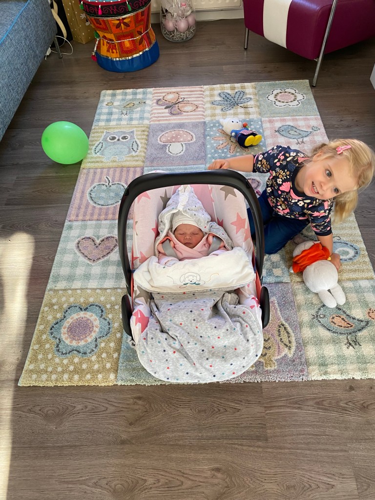 Vandaag is ons kleine meisje alweer drie weken oud! Gek genoeg zijn die drie weken ongemerkt voorbij gevlogen. Ook sta ik er amper bij stil dat het een feestelijke dag is vandaag. Dat heeft verschillende redenen. Een tweede kind is toch minder nieuw, dus hoe bewust je bij de eerste elke kleine ontwikkeling vierde, zo is dat nu toch net iets ‘gewoner’. Bovendien slokt nummer 1 nog altijd de meeste energie en aandacht, is niet minder aanwezig dan voor de geboorte van nummer 2, integendeel zou ik zeggen. We hebben ontzettend veel mazzel met beide meiden trouwens, zozeer dat ik me bijna schuldig voel naar gezinnen waar slaaptekort en moeilijk gedrag van de kinderen de energie uit de ouders slurpt. Hier niks geen jaloersigheid van de oudste naar de jongste, alleen maar behulpzaamheid en zorgzaamheid. Rosie-Lynn is bovendien nog gemakkelijker dan Lilly-Sofie als baby was, laat zich amper horen, slaapt zeker 20 uur per etmaal werkelijk als een roosje (in meerdere etappes wel te verstaan), drinkt daarnaast in tien minuten een borst leeg, boert dan even flink en slaapt weer verder. Waar ik bij de eerste nog bang was dat ik haar ergens zou vergeten (dat ik per ongeluk de kinderwagen in een winkel zou laten staan was mijn grootste nachtmerrie), totaal ongegrond trouwens want dat is gelukkig nooit gebeurd, merk ik nu bij de tweede dat ik ineens kan denken ‘oh ja er ligt nóg een meisje in de box!’ Gelukkig kent ze ook momenten dat ze ineens kan krijsen als een speenvarken, hebben we inmiddels ‘al’ twee spuitluiers gehad met een onvermijdelijke kledingwissel tot gevolg, en kan ze mijn schoot opeisen als enige plek waar ze haar rust vindt. Die momenten koester ik, want dan weet ik tenminste weer dat er écht een baby aan ons gezin is toegevoegd! Verder slaapt ze momenteel zó goed en veel dat ik op een gegeven moment ging googelen of dat misschien kwaad kan; gelukkig hoefde ik daar niet bang voor te zijn. Zelf kom ik daardoor ook best goed aan mijn rust toe. Ik merk wel dat ik nog volop aan het herstellen ben van de bevalling. Fysiek zit ik alweer aardig op gewicht, voor mijn gevoel weeg ik nu zelfs nog minder dan voor mijn zwangerschap. Als je je fysiek dan weer zo topfit voelt, heb je kans dat je jezelf gaat overschatten. Zo heb ik gisteren in een paar uur tijd 8000 stappen gezet (ik wilde Sinterklaasinkopen doen). Dat was dus een beetje te heftig, waardoor ik de rest van de dag de bank amper af ben gekomen. Alleen om naar de wc te gaan, waar ik constateerde dat de overenthousiaste wandeling mij ook nog eens een extra aambei heeft bezorgd. Geen fijne ontdekking kan ik je zeggen! Mentaal moet ik ook nog even aarden; ik zie vanalles wat ik in huis wil aanpakken, maar er komt nog maar weinig uit mijn vingers. De zorg voor 2 kindjes slokt aardig wat energie op, waardoor ik mezelf op de vrije momenten nog niet makkelijk kan motiveren om mijn handen te laten wapperen in huis. Ik merk eigenlijk vandaag pas dat me dat iets beter lukt; ik krijg er langzaam weer zin in om orde te scheppen in de chaos, ruim de keuken op en gooi alles weg wat we nooit gebruiken en dus ook niet zullen missen. Wat een heerlijk gevoel geeft dat! Voor Lilly-Sofie is de Sinterklaastijd aangebroken, na de geboorte van haar zusje is dit de volgende spannende tijd die voor de deur staat. Dan merk je wel dat het soms wat teveel is voor haar aan indrukken die ze moet verwerken. Ze heeft veel behoefte aan overzicht en is daarnaast veel bezig om alles te snappen wat er om haar heen gebeurt. ‘s Nachts kan ze hierdoor nog weleens wakker schrikken en ze is wat sneller moe en overprikkeld. Dat ze nu thuis geen middagslaapje (meer) doet, werkt daarin ook niet heel goed mee.. Zowel ‘s ochtends als ‘s avonds is het voor iedereen ook nog zoeken naar een nieuwe routine waarbij er ruimte is voor alles wat er moet gebeuren, zonder teveel af te wijken van hoe de routines tot nu toe waren. Hopelijk heeft die puzzel minder voeten in aarde dan de politiek aan dagen nodig heeft om de formatie rond te krijgen…